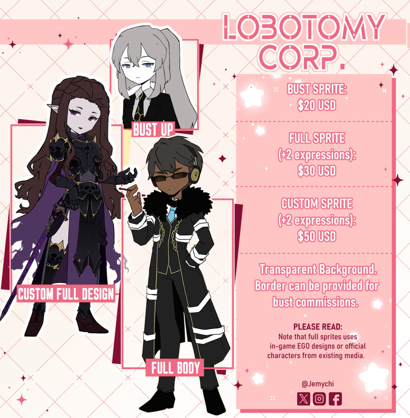 Bust Sprite: $20 USD Full Sprite: $30 USD (+2 free face expressions) Custom design: $50 USD (+2 free face expressions) ━━━━⊱⋆⊰━━━━ Full sprites uses in-game E.G.O gear & props. Official characters will count. Custom design will be made from scratch, ideas, or provided references. PNG versions will be provided.