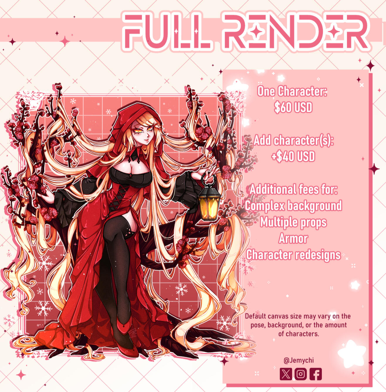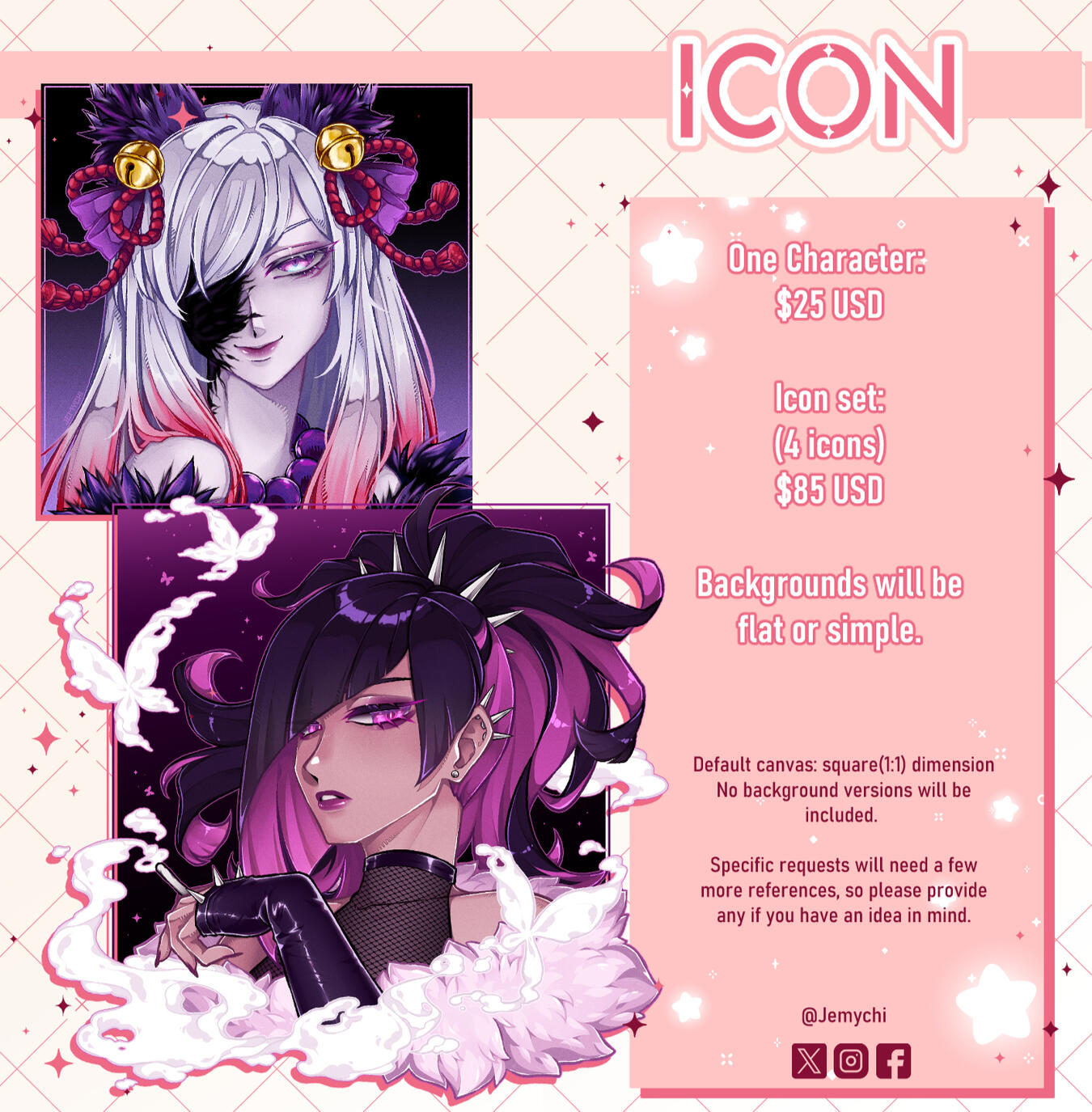 One character: $60 USD Additional Characters: +40 USD ━━━━⊱⋆⊰━━━━ Complex ideas, designs or backgrounds will have additional fees. PNG versions will be provided.