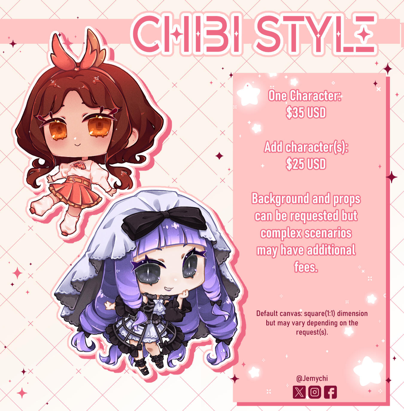 One character: $35 USD Additional Characters: +25 USD ━━━━⊱⋆⊰━━━━ Prop request are free. Complex ideas or backgrounds will have additional fees. PNG versions will be provided.